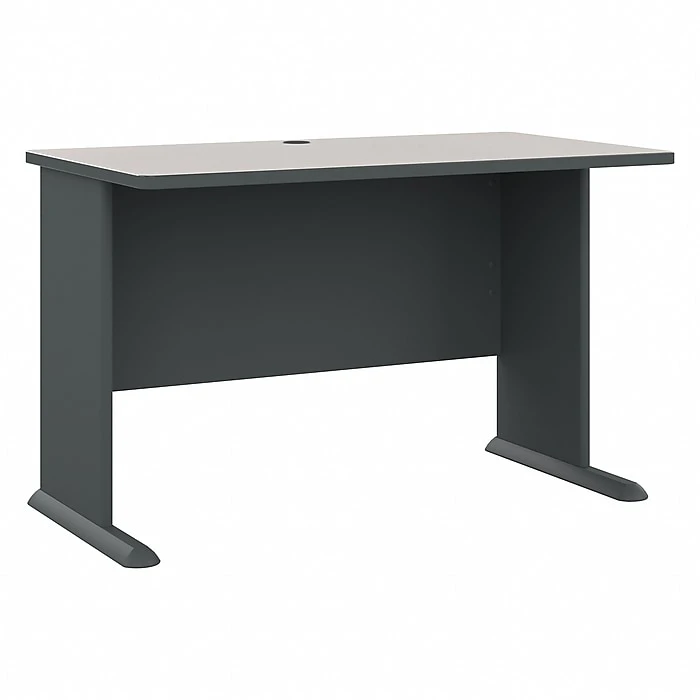 The Bush Business Furniture Cubix 48W Desk provides lasting comfort and durability in a compact package. Perfect for a small office or as part of a larger workspace, the commercial-grade Desk features an open C-Leg design to maximize legroom. Thick end panels resist damage, while a thermally fused laminate surface fends off scratches and stains for a long-lasting professional appearance. Wire management grommets organize and secure computer cables to keep them out of your way. Sturdy Desk feet include encapsulated steel armature and adjustable levelers for use on all types of flooring. Cubix offers a variety of layout options and multiple two-tone finishes. Backed by a 10 Year Warranty. American made with U.S. and imported parts.