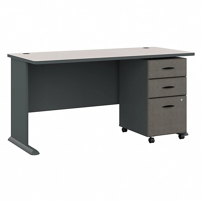 Convenient and comfortable with just the right amount of workspace, the Bush Business Furniture Cubix 60W Desk has the commercial quality you need for years of productivity. The durable thermally fused laminate surface fends off scratches and stains. Rugged edge banding and thick end panels resist damage as sturdy feet with adjustable levelers ensure stability. The comfortable C-leg design offers loads of legroom, and wire management grommets organize cables to keep them out of your way. Store work materials in the convenient Mobile File Cabinet, which fits under the Desk or rolls anywhere. The full-extension file drawer holds letter, legal and A4 documents. Drawers open on ball bearing slides for a smooth and easy reach to the back. Cubix offers a variety of layout options and 7 finishes. Backed by a 10 Year Warranty. American made with U.S. and imported parts.