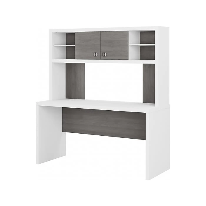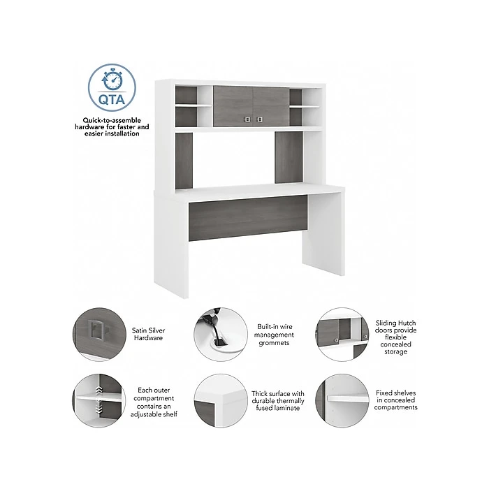 - Modern-style desk and hutch are made of engineered wood in pure white and modern gray laminate finishes