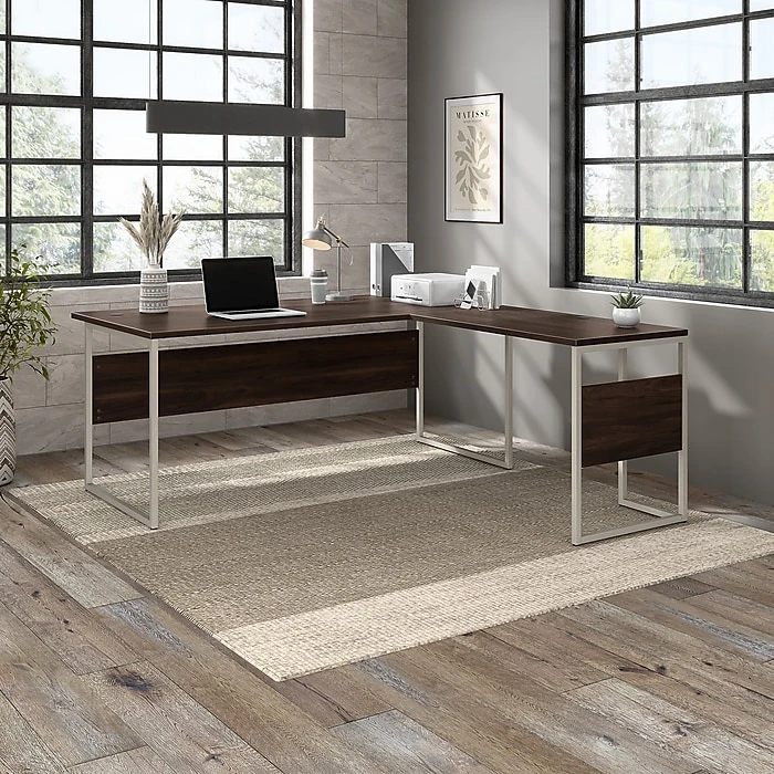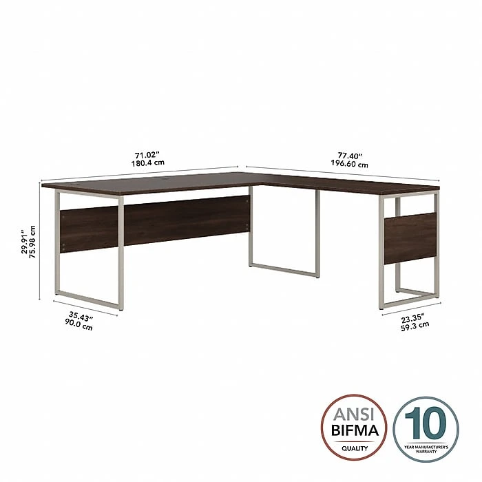 The Bush Business Furniture Hybrid L-shaped table desk blends a durable work surface with sturdy metal legs to offer a stylish, long-lasting solution for the modern professional. Tackle your next project or assignment with a computer, books, and more on a desktop that supports up to 200 lbs. Four built-in wire management grommets keep cords and cables in order, so your work area remains free from unnecessary clutter. The corner desk’s open leg design and finished privacy panel allows it to look great facing any direction in a home or professional office environment. This modern computer desk has been meticulously tested to meet or exceed the ANSI/BIFMA standards for safety, durability, and performance and is backed by a 10-year manufacturer warranty. American-made with US and imported parts.