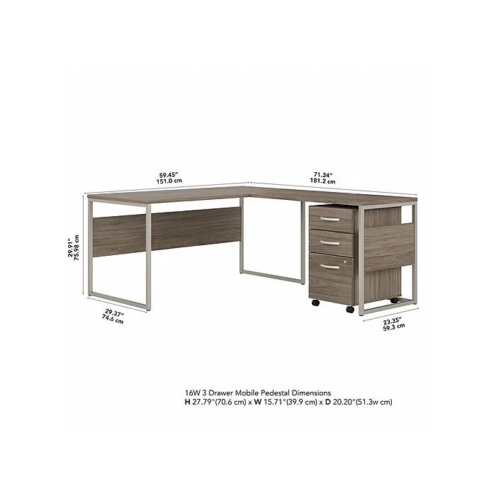 The Bush Business Furniture Hybrid L-shaped table desk with three-drawer mobile file cabinet blends a durable work surface with sturdy metal legs to offer a stylish, long-lasting solution for the modern professional. Tackle your next project or assignment on a desktop that supports up to 200 lbs. and has three built-in wire management grommets to keep cords and cables in order. The corner computer desk’s open leg design and finished privacy panel allow it to look great facing any direction in a home or professional office. The file cabinet’s bottom drawer holds letter-, legal-, and A4-size paperwork, while two box drawers organize supplies. This L-shaped desk with drawers has been meticulously tested to meet or exceed ANSI/BIFMA standards for safety, durability, and performance and is backed by a 10-year manufacturer warranty. American-made with US and imported parts.
