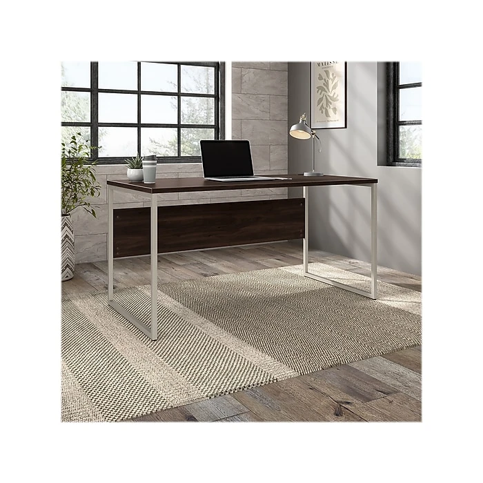 The Bush Business Furniture Hybrid 60″W x 30″D computer table desk blends a durable work surface with sturdy metal legs to offer a stylish, long-lasting solution for the modern professional. Tackle your next project or assignment with a computer, books, paperwork, and more on a desktop that supports up to 200 lbs. Two built-in wire management grommets keep cords and cables in order, so your work area remains free from unnecessary clutter. The computer desk’s open leg design and finished privacy panel allow it to look great facing any direction in a home or professional office environment. Find the perfect look for your space with five contemporary finish options: black walnut, modern hickory, platinum gray, storm gray, and white. This modern desk has been meticulously tested to meet or exceed ANSI/BIFMA quality standards for safety, durability, and performance and is backed by the Bush Business Furniture 10-year manufacturer warranty. See the full Hybrid collection for coordinating items to enhance your workspace as needed, including file cabinets, bookcases, and storage cabinets (coordinating items sold separately). American-made with US and imported parts.