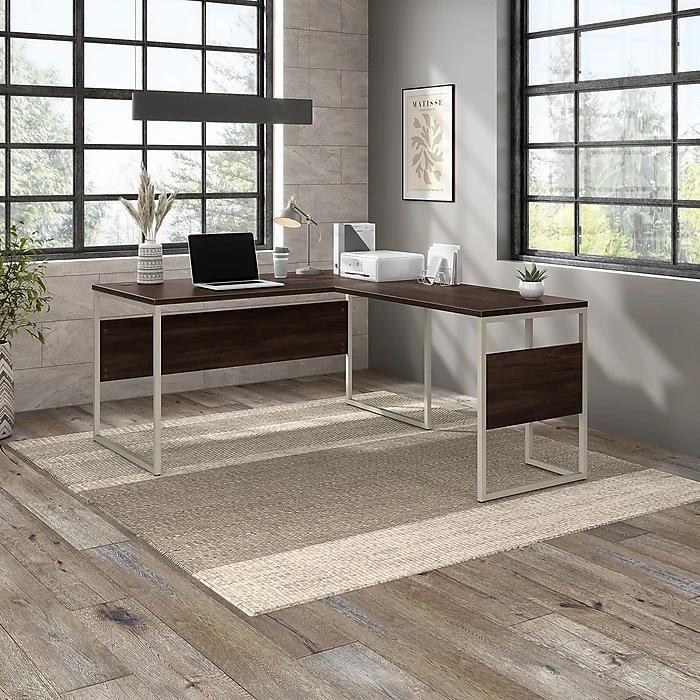 The Bush Business Furniture Hybrid L-shaped table desk blends a durable work surface with sturdy metal legs to offer a stylish, long-lasting solution for the modern professional. Tackle your next project or assignment with a computer, books, and more on a desktop that supports up to 200 lbs. Three built-in wire management grommets keep cords and cables in order, so your work area remains free from unnecessary clutter. The corner desk’s open leg design and finished privacy panel allows it to look great facing any direction in a home or professional office environment. This modern computer desk has been meticulously tested to meet or exceed the ANSI/BIFMA standards for safety, durability, and performance and is backed by a 10-year manufacturer warranty. American-made with US and imported parts.