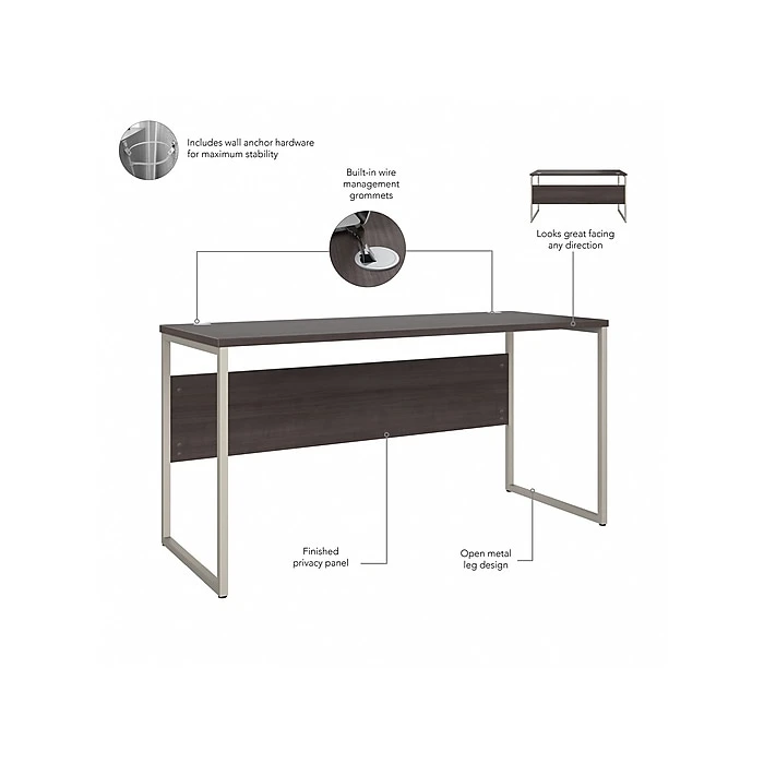 The Bush Business Furniture Hybrid 60″W x 24″D computer table desk blends a durable work surface with sturdy metal legs to offer a stylish, long-lasting solution for the modern professional. Tackle your next project or assignment with a computer, books, paperwork, and more on a desktop that supports up to 200 lbs. Two built-in wire management grommets keep cords and cables in order, so your work area remains free from unnecessary clutter. The computer desk’s open leg design and finished privacy panel allow it to look great facing any direction in a home or professional office environment. Find the perfect look for your space with five contemporary finish options: black walnut, modern hickory, platinum gray, storm gray, and white. This modern desk has been meticulously tested to meet or exceed ANSI/BIFMA quality standards for safety, durability, and performance and is backed by the Bush Business Furniture 10-year manufacturer warranty. See the full Hybrid collection for coordinating items to enhance your workspace as needed, including file cabinets, bookcases, and storage cabinets (coordinating items sold separately). American-made with US and imported parts.