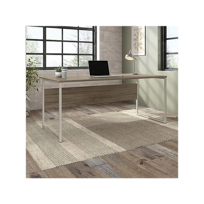 The Bush Business Furniture Hybrid 72″W x 36″D computer table desk blends a durable work surface with sturdy metal legs to offer a stylish, long-lasting solution for the modern professional. Tackle your next project or assignment with a computer, books, and more on a desktop that supports up to 200 lbs. Three built-in wire management grommets keep cords and cables in order, so your work area remains free from unnecessary clutter. The computer desk’s open leg design and finished privacy panel allow it to look great facing any direction in a home or professional office. Find the perfect look for your space with five finish options: black walnut, modern hickory, platinum gray, storm gray, and white. This modern desk has been meticulously tested to meet or exceed ANSI/BIFMA quality standards for safety, durability, and performance and is backed by the Bush Business Furniture 10-year manufacturer warranty. See the full Hybrid collection for coordinating items to enhance your workspace as needed, including bookcases, lateral file cabinets, and storage cabinets (coordinating items sold separately). American-made with US and imported parts.