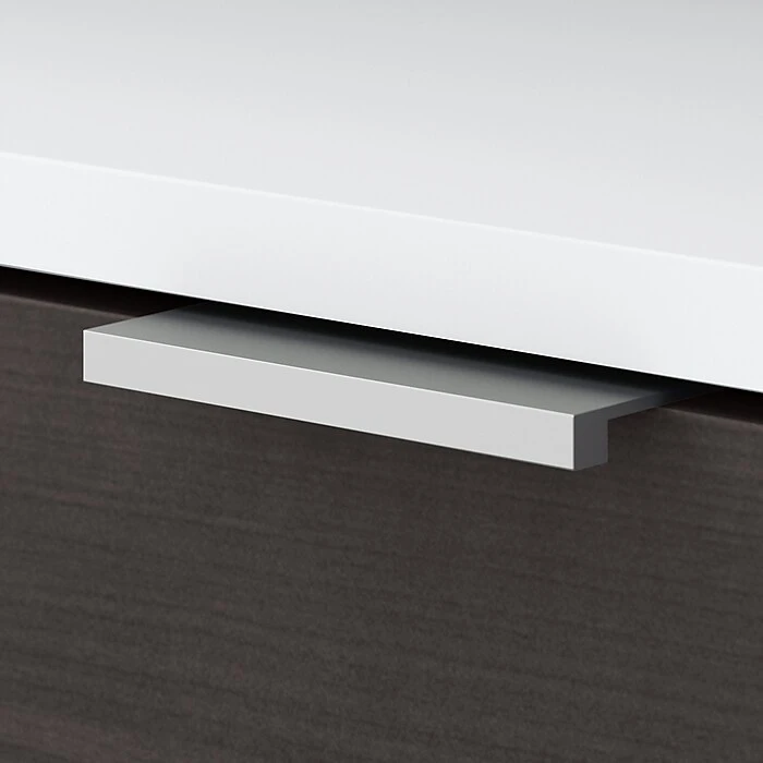 - L-shaped desk and lateral file cabinet are finished in contemporary style on all sides for versatile placement in a private office or open floor plan