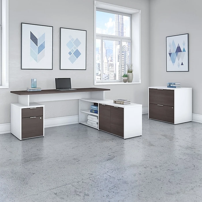 With its contemporary style and an adaptable modular design, the Bush Business Furniture Jamestown 71″W L-shaped desk with drawers and lateral file cabinet is built to meet the ever-changing demands of today’s workplace. The elevated 71″W x 24″D surface easily accommodates multiple monitors with a 200 lb. weight capacity. The computer desk is supported by a 59.17″W low storage return on one side and a lockable two-drawer file cabinet on the other for convenient access to supplies. Open and closed compartments each include one adjustable shelf to store items of various sizes. Additional legal-, letter-, and A4-size paperwork can be organized in the lateral filing cabinet, which also locks to protect sensitive information. This L-desk with storage is tested to meet ANSI/BIFMA standards for safety and performance and is backed by a 10-year warranty. American-made with US and imported parts.