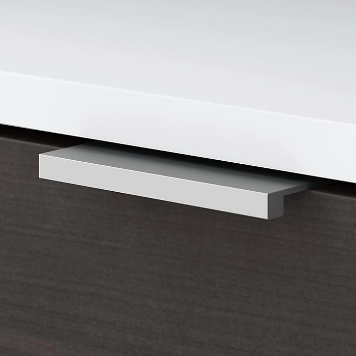 - L-shaped desk with storage is finished in contemporary style on all sides for versatile placement in a private office or open floor plan