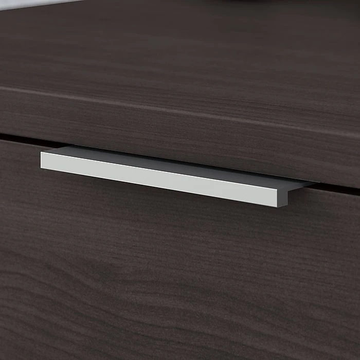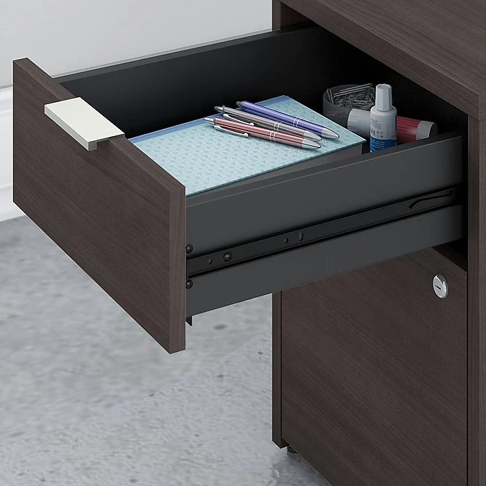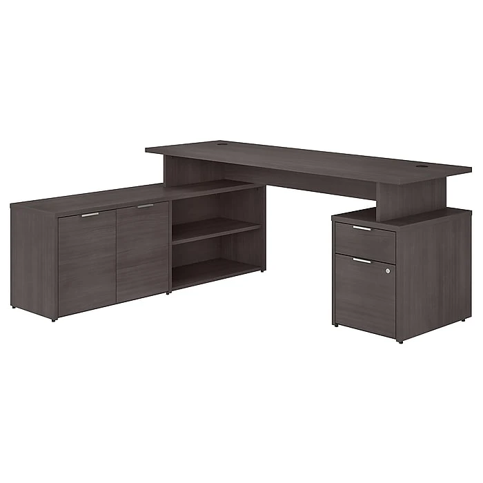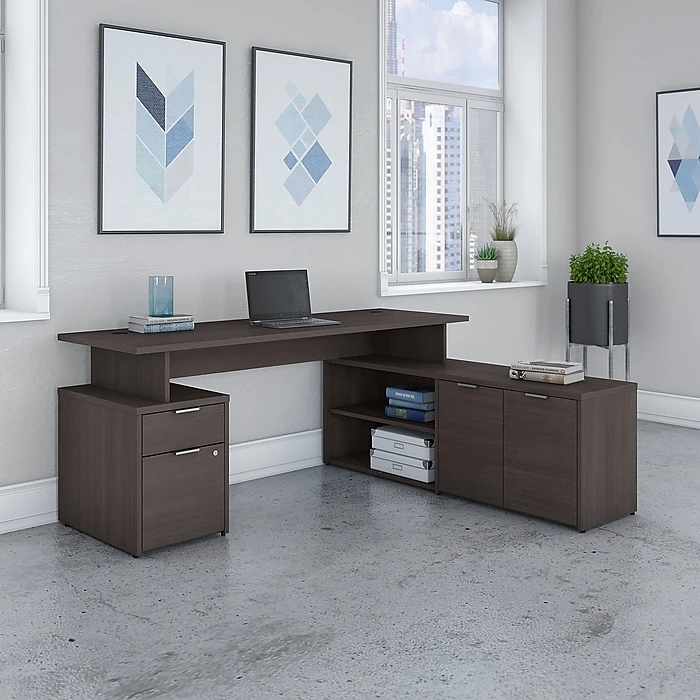 From large corporations to a single remote workspace, the Bush Business Furniture Jamestown 71″W L-shaped desk with drawers meets the needs of any office. With its contemporary style and an adaptable modular design, the Bush Business Furniture Jamestown 71″W L-shaped desk with drawers is built to meet the ever-changing demands of today’s workplace. The elevated 71.02″W x 23.66″ surface accommodates multiple monitors and other equipment with a 200 lbs. weight capacity. One side of the computer desk is supported by a 59.17″W low storage return with open and closed compartments, each of which includes one adjustable shelf for the flexibility to store items of various sizes. On the other side is a 2-drawer file cabinet that accepts legal-, letter-, and A4-size paperwork. A single lock secures both of the filing cabinet’s drawers to protect sensitive documents and valuable items. This L-shaped desk with storage is tested to meet ANSI/BIFMA standards for safety and performance and is backed by a 10-year warranty. American-made with US and imported parts.