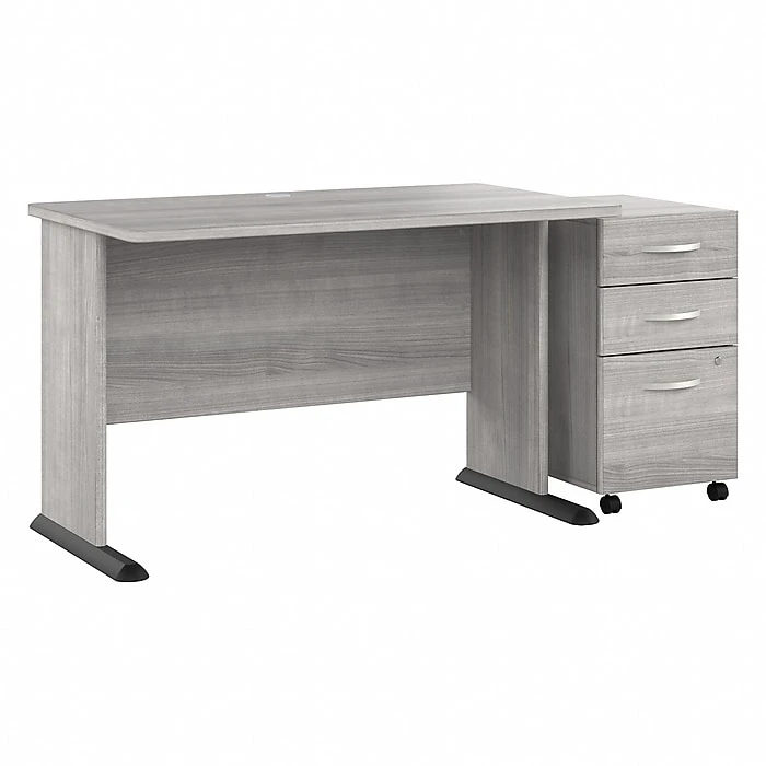 The Bush Business Furniture Studio A 48″W computer desk with three-drawer mobile file cabinet combines a fresh contemporary appearance with the commercial-quality construction needed to withstand years of everyday use. Set up with a computer and equipment on the durable thermally fused laminate desktop that supports up to 200 lbs. A built-in wire management grommet keeps cords and cables in order, so the surface remains free from unnecessary clutter. The file cabinet’s bottom drawer accepts letter-, legal-, and A4-size paperwork, while two box drawers organize supplies. The two bottom drawers can be locked to protect sensitive files and personal items. This small desk with drawers has been meticulously tested to meet or exceed the ANSI/BIFMA standards for safety, durability, and performance and is backed by a 10-year manufacturer limited warranty. American-made with US and imported parts.