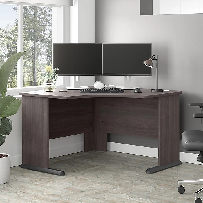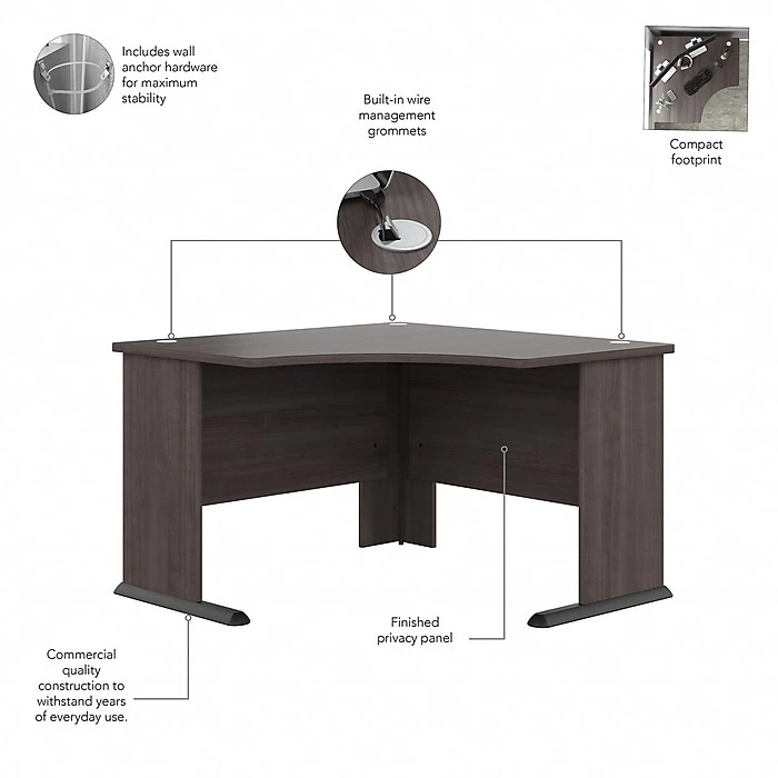 The Bush Business Furniture Studio A 48″W corner computer desk combines a fresh contemporary appearance with the commercial-quality construction needed to withstand years of everyday use. Conveniently designed to be placed in a corner of your choosing, this compact desk is a perfect choice for working or gaming where space is limited. Set up with a computer and equipment on the durable desktop that supports up to 200 lbs. Three built-in wire management grommets keep cords and cables in order, so the surface remains free from unnecessary clutter. Wall attachment hardware is included for maximum safety and security in any home or professional office. This small corner desk has been meticulously tested to meet or exceed the ANSI/BIFMA quality standards for safety, durability, and performance and is backed by a 10-year manufacturer warranty. American-made with US and imported parts.