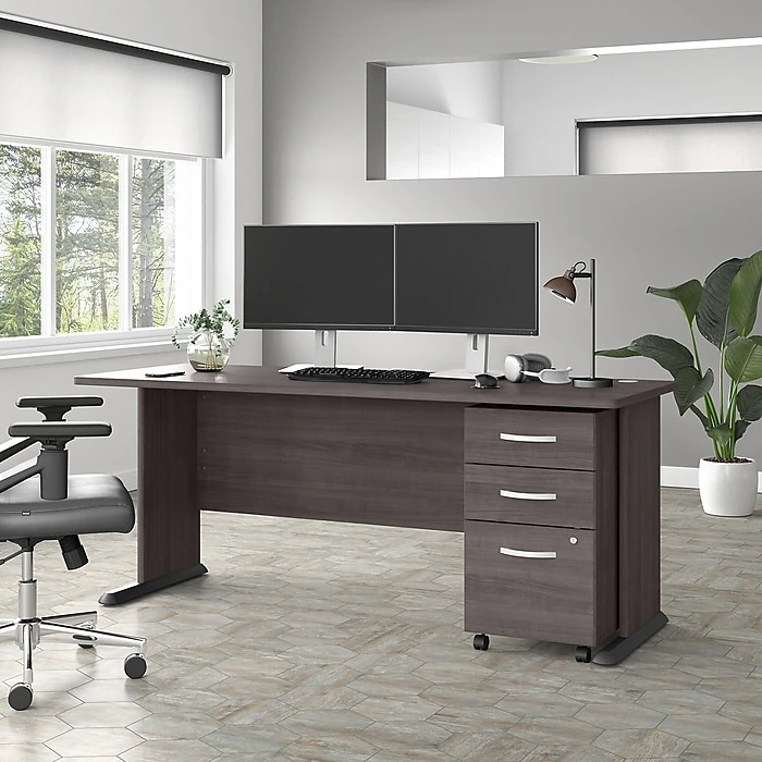 The Bush Business Furniture Studio A 72″W computer desk with three-drawer mobile file cabinet combines a fresh contemporary appearance with the commercial-quality construction needed to withstand years of everyday use. Set up with a computer and equipment on the durable thermally fused laminate desktop that supports up to 200 lbs. Three built-in wire management grommets keep cords and cables in order, so the surface remains free from unnecessary clutter. The file cabinet’s bottom drawer accepts letter-, legal-, and A4-size paperwork, while two box drawers organize supplies. The two bottom drawers can be locked to protect sensitive files and personal items. This office desk with drawers has been meticulously tested to meet or exceed the ANSI/BIFMA standards for safety, durability, and performance and is backed by a 10-year manufacturer limited warranty. American-made with US and imported parts.