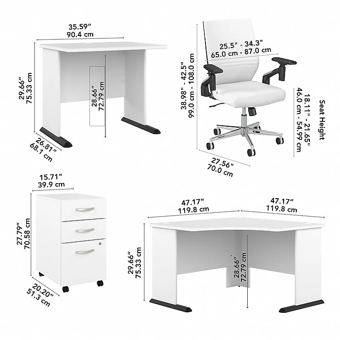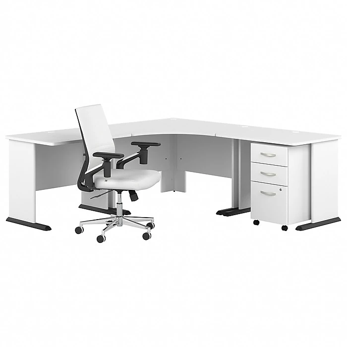 The Bush Business Furniture Studio A 83″W large corner gaming desk with chair and drawers features a fresh, contemporary appearance and commercial-quality construction that promises to withstand years of regular use. Take your gaming setup to the next level with an expansive L-shaped desktop that supports up to 200 lbs. and includes three built-in wire management grommets. The gaming chair’s bonded leather upholstery, foam cushioning, and adjustable lumbar support provide plenty of comfort for hours of gaming. The rolling file cabinet’s bottom drawer can hold letter-, legal-, and A4-size papers, while a pair of box drawers organize batteries, extra cables, and more. This gaming computer desk and chair set has been meticulously tested to meet or exceed ANSI/BIFMA standards for safety, durability, and performance and is backed by a 10-year warranty. American-made with US and imported parts.