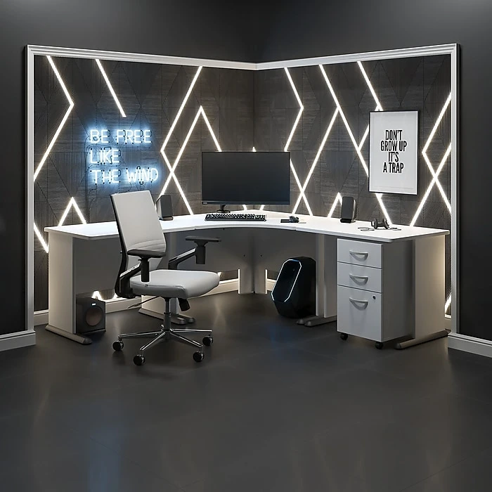 - L-shaped desk features a contemporary style