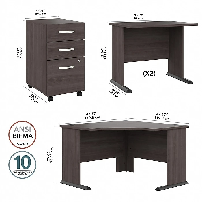 - Bundle includes: 48″W corner computer desk, set of two 36″W small computer desks, and three-drawer mobile file cabinet