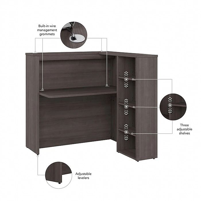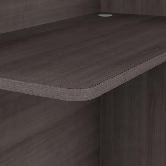- Commercial desk and shelves are made of engineered wood in a storm gray laminate finish