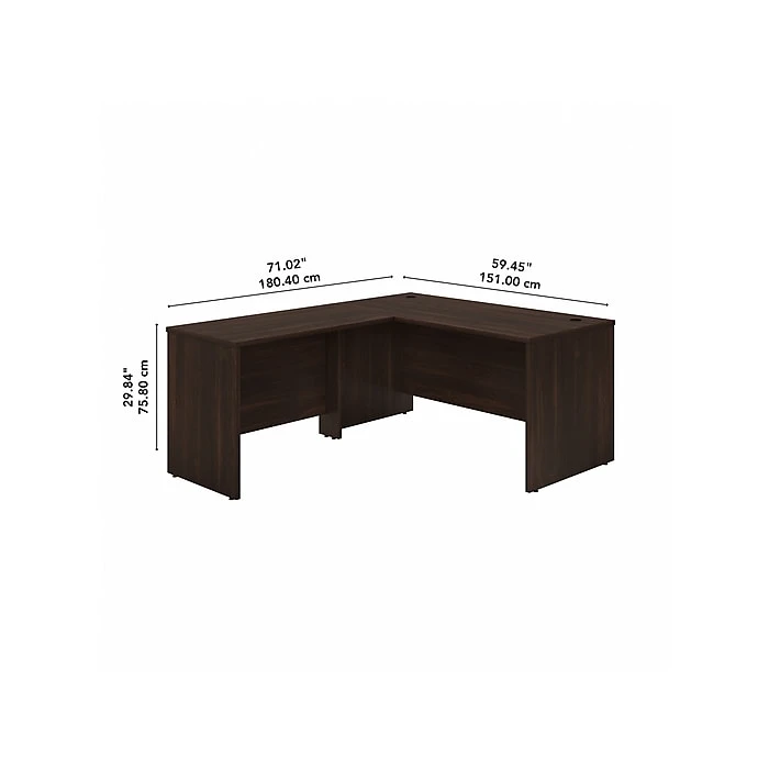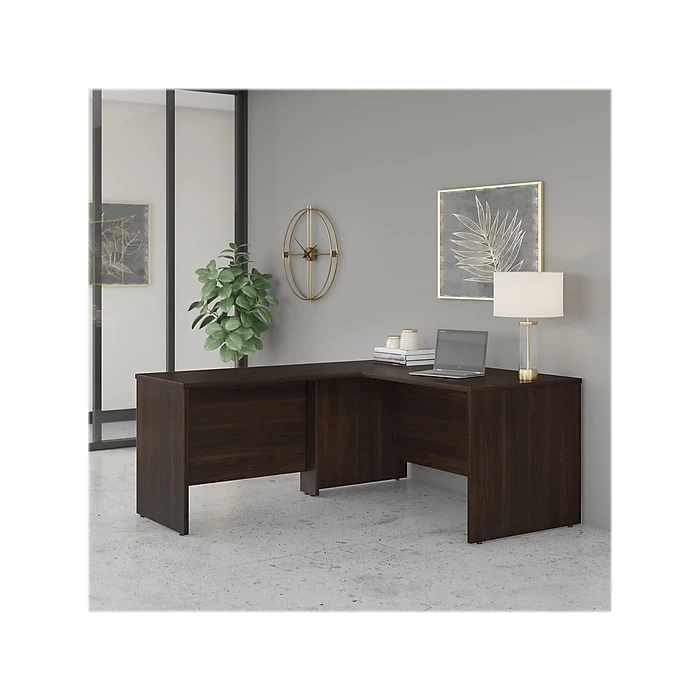 Highlighted by its contemporary style and commercial quality design, the Bush Business Furniture Studio C 60″W L-shaped desk with 42″W return presents a great workspace for a modern professional. Take advantage of the spacious surface to spread out with a computer, paperwork, and more as you tackle your next big project. The L-shaped desktop easily accommodates multiple monitors and other materials with a 200 lb. weight capacity and built-in wire management grommets. Position the L-shaped desk in a corner to save space in a small private office, or make use of the finished back to face outward in an open-plan environment. The return can be installed on either side of the main work surface for a right- or left-handed configuration. This corner desk is tested to meet ANSI/BIFMA standards for safety and performance and is backed by a 10-year manufacturer limited warranty. American-made with US and imported parts.