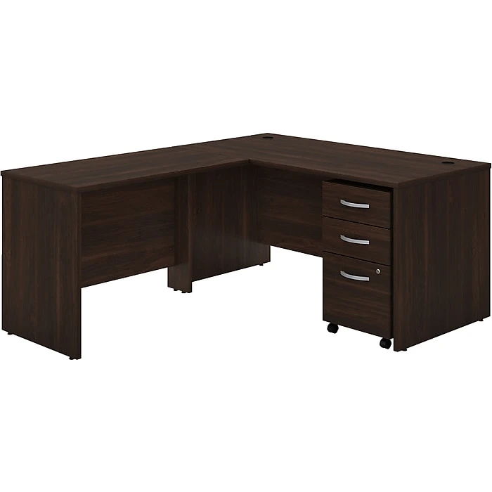 - Bundle includes: 60″W x 30″D L-shaped office desk, 42″W desk return, three-drawer mobile file cabinet