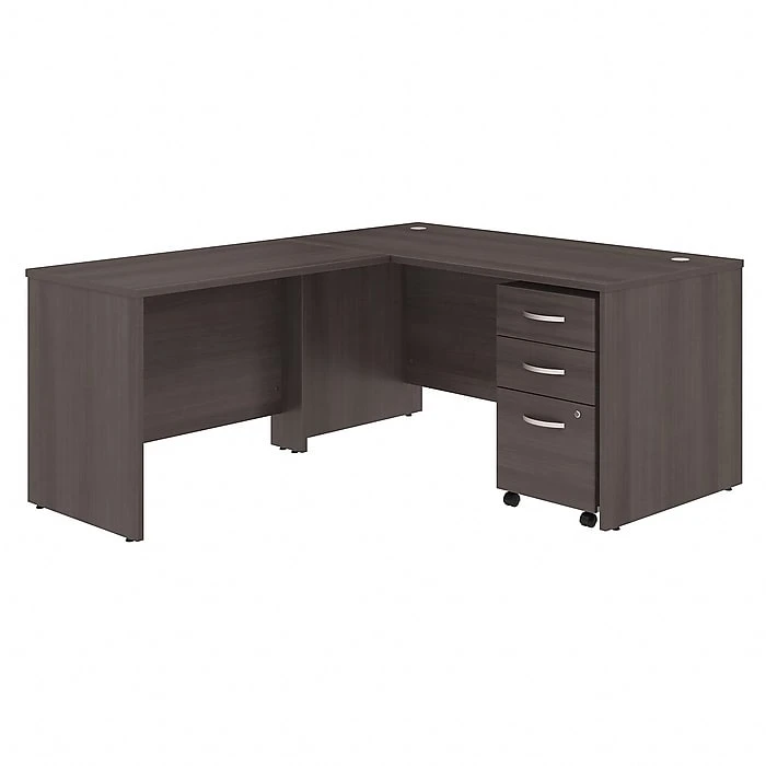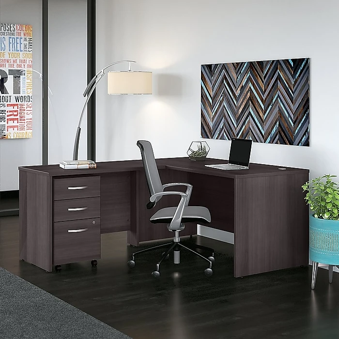 Choose this Bush Business Furniture Studio C L Shaped Desk for a comfortable design that works with you for years and a fresh finish that looks great anywhere. With a thick surface, an extended modesty panel and clean lines, the L Shaped Desk conveys a classic look but adds a contemporary White or Storm Gray finish to meet the style needs of the modern workspace. The thermally fused laminate finish, durable edge banding and sturdy end panels resist scratches, stains or dents while standing up to the rigors of a 40-plus hour work week. Keep pesky computer cords out of your way with the cable management system for an organized work surface. The 42W Return attaches to either side of the Desk to form a left or right handed L Shaped layout, while the 3 Drawer Mobile File Cabinet rolls with you throughout your office or remains in place as needed on any surface. This contemporary office furniture comes with a 10 Year Warranty and meets ANSI/BIFMA quality test standards. American made with U.S. and imported parts.