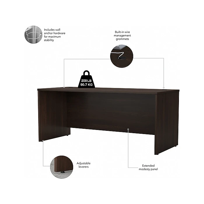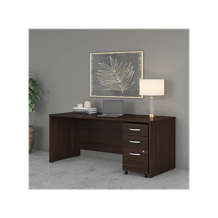 Choose the Bush Business Furniture Studio C 72″W office desk with mobile file cabinet for a durable workspace that looks great and lasts for years. The thermally fused laminate finish, edge banding, and end panels resist scratches, stains, and dents while standing up to the rigors of a 40-plus hour workweek. Keep computer cords out of your way with the cable management system for an organized work surface. The three-drawer file cabinet rolls throughout your office or remains in place as needed. A full-extension file drawer opens on smooth ball bearing slides for an easy reach to letter-, legal-, and A4-size paperwork while two box drawers organize supplies. A single lock secures the bottom drawers to protect sensitive documents and personal items. This desk with storage set comes with a 10-year manufacturer limited warranty and meets ANSI/BIFMA quality test standards. American-made with US and imported parts.