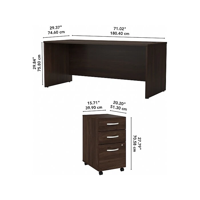 - Bundle includes: 72″W x 30″D office desk and three-drawer mobile file cabinet
