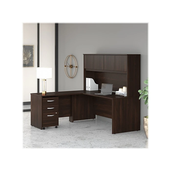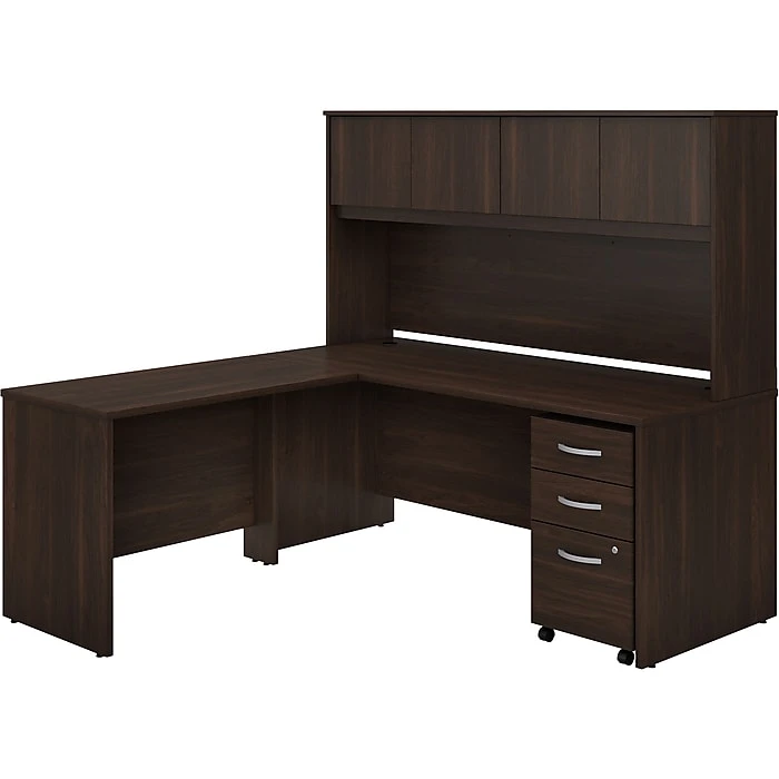 Choose this Bush Business Furniture Studio C L-shaped desk with hutch and mobile file cabinet for a comfortable design that works with you for years. The thermally fused laminate finish, durable edge banding, and sturdy end panels resist scratches, stains, and dents while standing up to the rigors of a 40-plus hour work week. The 42″W return attaches to either side of the 72″W desk to form a left- or right-handed L-shaped layout. With four doors featuring self-closing Euro-style hinges, the hutch conveniently stores office supplies, books, and more. The three-drawer file cabinet rolls throughout your office or remains in place as needed on any surface. One file drawer accepts legal-, letter-, and A4-size paperwork while two box drawers organize supplies. This desk with storage set comes with a 10-year manufacturer limited warranty and meets ANSI/BIFMA quality test standards. American-made with US and imported parts.