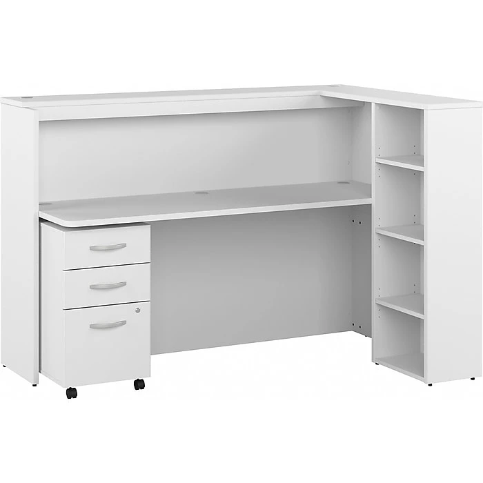 - Bundle includes: 72″W cubicle desk with shelves, three-drawer mobile file cabinet