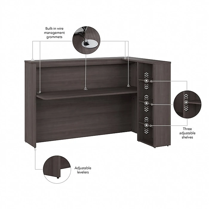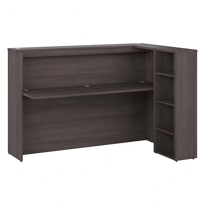 - Commercial desk and shelves are made of engineered wood in a storm gray laminate finish