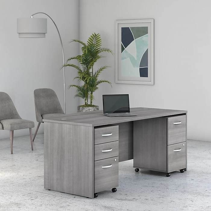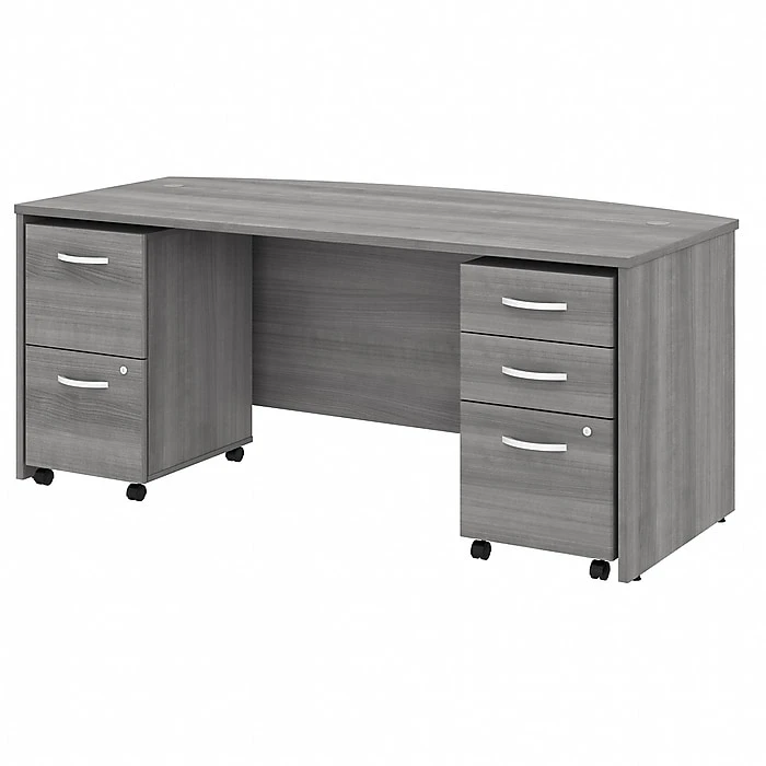 - Bundle includes: 71″W bow front desk, two-drawer mobile file cabinet, and three-drawer mobile file cabinet