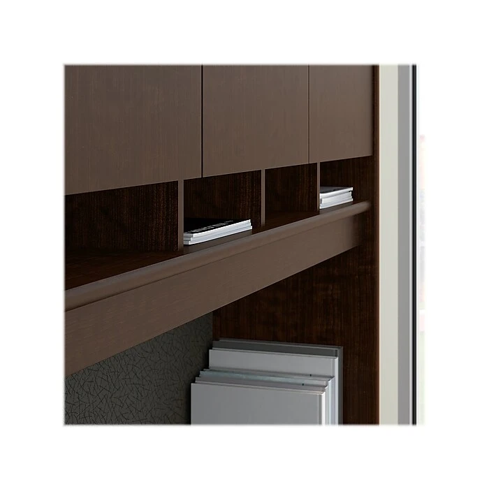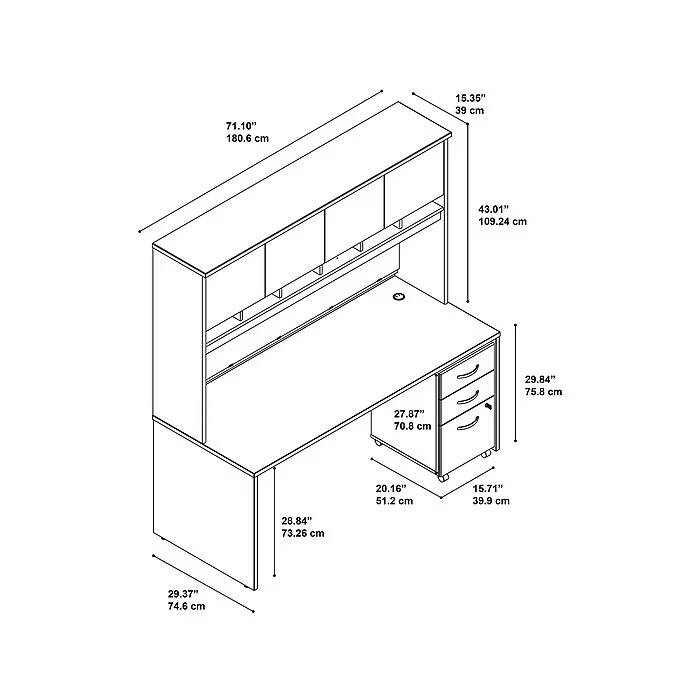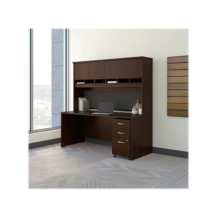 Get the workspace, storage and durability you require for years of use, and convenient features to help you make the most of every day. The Bush Business Furniture Westfield office desk with a hutch and mobile file cabinet provides a sturdy construction, rugged, thermally fused laminate finish and tough edge banding for continued quality. Wire management grommets conceal your cables, and the expansive office desk gives you all the room you need to spread out with your projects. The hutch has a fully finished back panel. A fabric tack board and six open cubby shelves keep current work nearby, and four concealed cabinets clear your work area. The mobile file cabinet locks for your security and includes a full-extension file drawer gliding on smooth ball bearing slides for easy access to documents.