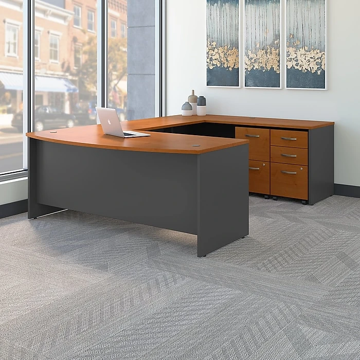 Sophisticated and spacious, this Bush Business Furniture Westfield U Shaped Desk brings commercial-quality features and durability to the workplace. The expansive wraparound U Shaped Desk includes all the room a busy professional needs to spread out for years of productivity. An inviting Bow Front design offers an extended surface for guests to pull up chairs and collaborate, while integrated wire management controls your electronics cables for a tidy workspace. The thermally fused laminate surface and sturdy construction combine with Brushed Nickel hardware and extended modesty panels for a lasting professional appearance you’ll love. The Mobile File Cabinets lock for your security and feature 3 full-extension file drawers and 2 box drawers combined. Westfield offers endless layout options and 7 finishes. Backed by a 10 Year Warranty. American made with U.S. and imported parts.