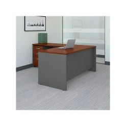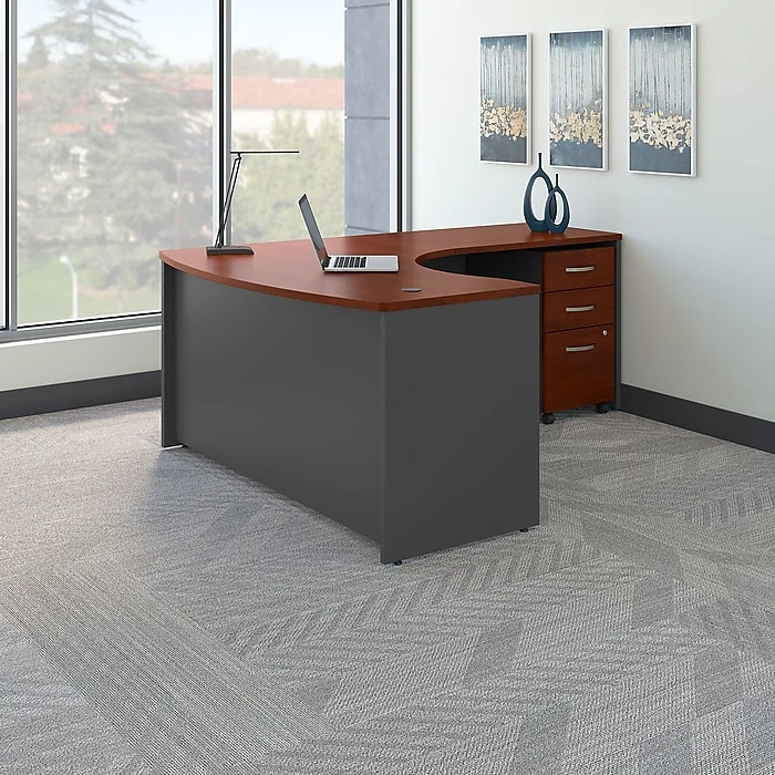 Work with the convenience you want and the durability you need. This Bush Business Furniture Westfield Right Handed L Shaped Desk makes the most of your office space with a clever construction and user-friendly features. Attractive and inviting, the Bow Front design gives guests the space they need to pull up chairs and collaborate. Spread out on the L Shaped Desk and feed your cables through wire management grommets in the surface to keep them concealed. The thermally fused laminate finish and sturdy construction provide long-lasting professional quality. Guide the Mobile File Cabinet throughout your office or store it under the L Shaped Desk to save space. Enjoy easy access to paperwork with a full-extension file drawer gliding on smooth ball bearing slides. Westfield offers endless layout options and 7 finishes. Backed by a 10 Year Warranty. American made with U.S. and imported parts.