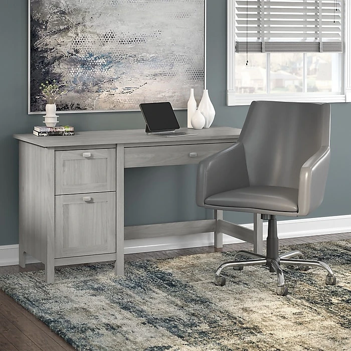 The Bush Furniture Broadview computer desk and mid-back leather box chair mixes fashion and function for a home office solution with long-lasting appeal. The 54″W x 23″D desktop offers plenty of room for materials while you take on your next big project or assignment. A pullout drawer with flip down front makes a perfect keyboard tray and can also be used to hold a laptop or tablet. Organize mail and other letter-size paperwork in a file drawer that opens on smooth ball bearing slides, and use the box drawer to keep supplies and utensils easily accessible. Foam cushioning gives the box chair a medium-firm feel while the curved backrest wraps around the body and tapers at the sides to support the arms. The desk chair’s height and tilt tension can be adjusted to meet your own preferences.
