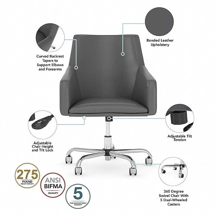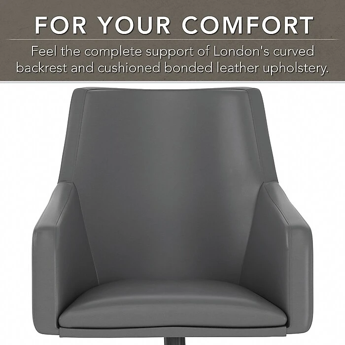 - Desk chair features smooth bonded leather upholstery with medium-firm foam cushioning