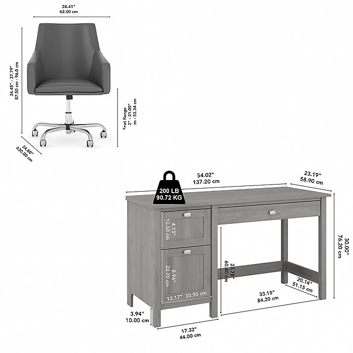 - Assembled dimensions: 30″H x 54.02″W x 23.19″D (desk), 34.45-37.79″H x 24.41″W x 24.8″D (chair)