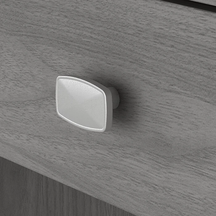 - Satin chrome drawer pulls bring an elegant look to your workspace