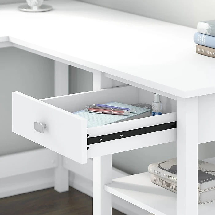 The contemporary Bush Furniture Broadview 60″W L-shaped computer desk with storage allows you to enjoy a practical home office without sacrificing style. Bring a contemporary flair to your home office with a workspace that’s simple, stylish, and functional. The Bush Furniture Broadview 60″W L-shaped computer desk with storage offers plenty of room to spread out while keeping work materials organized and accessible. The durable 60″W x 60″D corner desk surface easily supports a computer, books, and more with a weight capacity of 200 lbs.. Two shelves and a small box drawer ensure that papers, writing utensils, notebooks, and other office supplies are always within reach. The bottom shelf is fixed for stability while the upper shelf can be raised or lowered to accommodate items of various sizes. A thoughtful, space-saving design that’s finished on all sides works well in a corner or facing outward into the room. This corner computer desk is tested to meet ANSI/SOHO quality standards for safety and performance and is backed by a 1-year warranty.