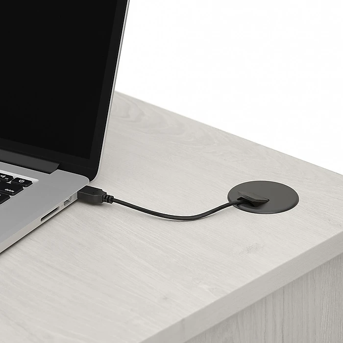 - Home office desk includes a wire management grommet on its surface to accommodate cords