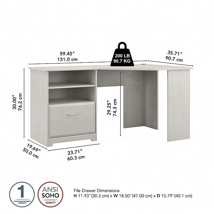 A timeless design with smart features and storage makes the Bush Furniture Cabot 60″W corner desk a great fit for any modern or traditional home office. The desk offers ample storage, technology integration, and plenty of workspace for a stylish addition to your home office. The corner computer desk’s storage features can be placed on whichever side you prefer for a customizable configuration. The unique design saves space in compact areas while still providing a roomy work surface to spread out and be productive. A full-extension file drawer opens on smooth ball bearing slides for an effortless reach to letter-, legal-, and A4-size paperwork while an open cubby shelf works perfectly for storing books and more. Cable management grommet on the desktop lets you easily hide unsightly cords. This home office desk with storage is tested to meet ANSI/BIFMA standards for safety and performance and is backed by the Bush Furniture 1-year manufacturer’s warranty.