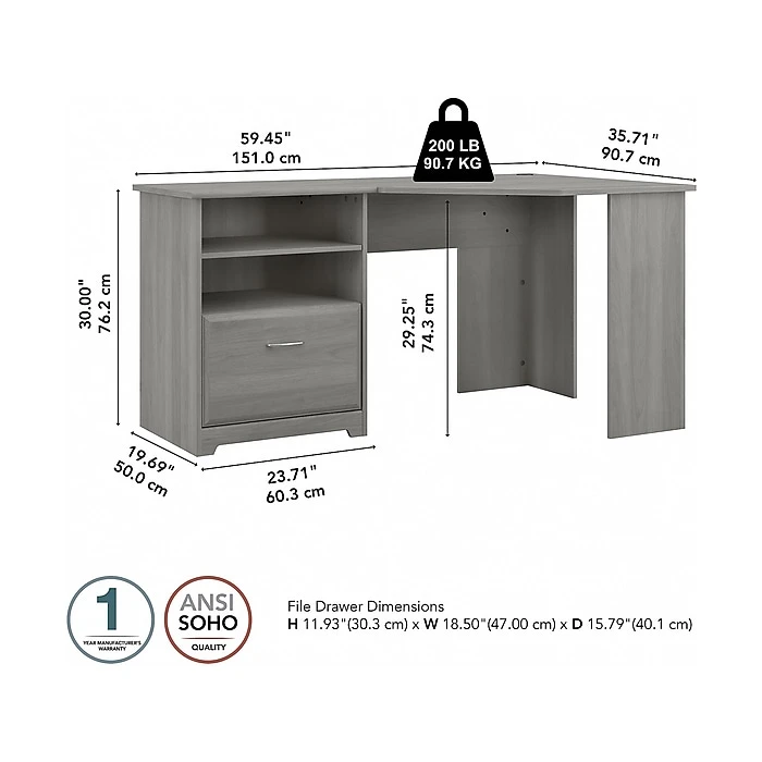 A timeless design with smart features and storage makes the Bush Furniture Cabot 60″W corner desk a great fit for any modern or traditional home office. The Bush Furniture Cabot 60W corner desk offers ample storage, technology integration, and plenty of workspace for a stylish addition to your home office. The corner computer desk’s storage can be placed on whichever side you prefer for a customizable configuration. The unique design saves space in compact areas while still providing a roomy work surface to spread out and be productive. A full-extension file drawer opens on smooth ball bearing slides for an effortless reach to letter-, legal-, and A4-size paperwork while an open cubby shelf works perfectly for storing books and more. Cable management grommets on the desktop let you easily hide unsightly cords. This home office desk with storage is tested to meet ANSI/BIFMA standards for safety and performance and is backed by the Bush Furniture 1-year manufacturer warranty.