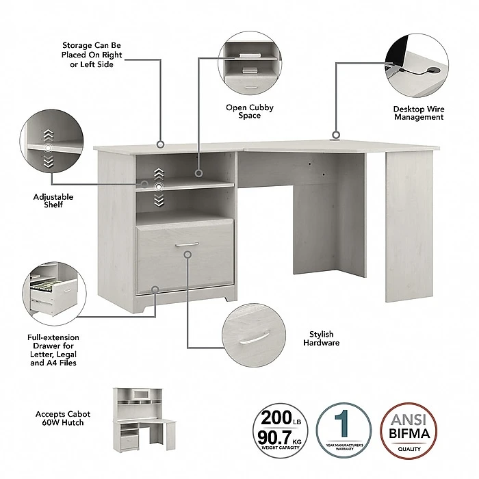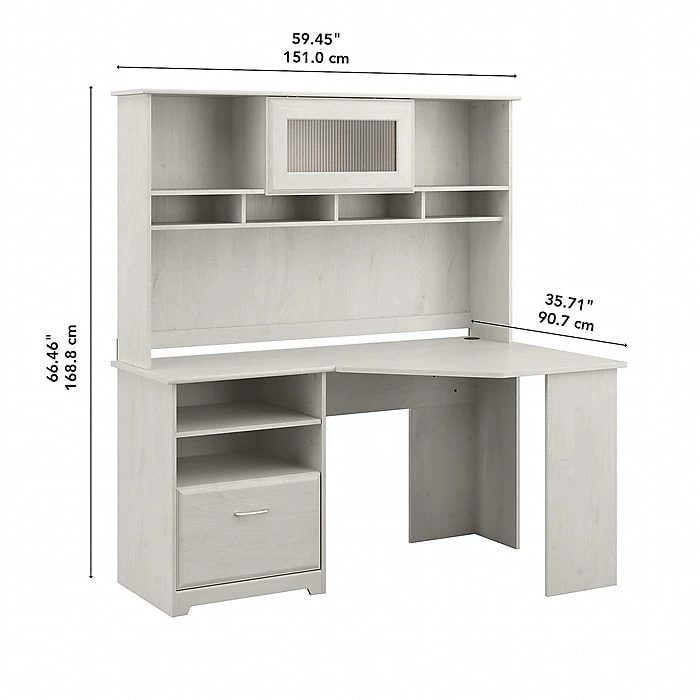 Featuring ample storage and technology integration, the Bush Furniture Cabot 60″W corner desk with hutch is a smart fit for modern and traditional home offices. The stylish and functional Bush Furniture Cabot corner desk with hutch offers everything you need for a simple space-saving home office solution. The 59″W corner computer desk and hutch combination is perfect for small spaces, yet provides ample room to work comfortably and stay organized. Storage can be placed on the right or left side for user preference and comfort. A full-extension file drawer glides on smooth ball bearing slides for an effortless reach to letter- and legal-size documents, and an open cubby shelf is perfect for keeping books and office supplies in order. The hutch boasts an elegant fluted glass door, two open compartments, and four work-in-progress areas to help keep your desk surface clutter-free. This home office desk with storage set is tested to meet ANSI/BIFMA standards for safety and performance and is backed by the Bush Furniture 1-year manufacturer’s warranty.