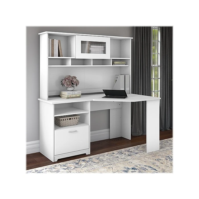 Featuring ample storage and technology integration, the Bush Furniture Cabot 60″W corner desk with hutch is a smart fit for modern and traditional home offices. The stylish and functional desk offers everything you need for a space-saving home office solution. Corner desk and hutch combination is perfect for small spaces yet provides ample room to work and stay organized. The corner desk’s storage can be placed on the right or left side for user comfort. A full-extension file drawer glides on smooth ball-bearing slides for an easy reach to documents, and open cubby shelves work perfectly for displaying books and more. Cable management grommets let you easily hide unsightly cords. The hutch boasts an elegant fluted-glass door, two open compartments, and four work-in-progress areas. Chrome-finished hardware complements your choice to complete the timeless design. See the full collection for coordinating items. This desk with storage set is backed by a 1-year manufacturer’s warranty.