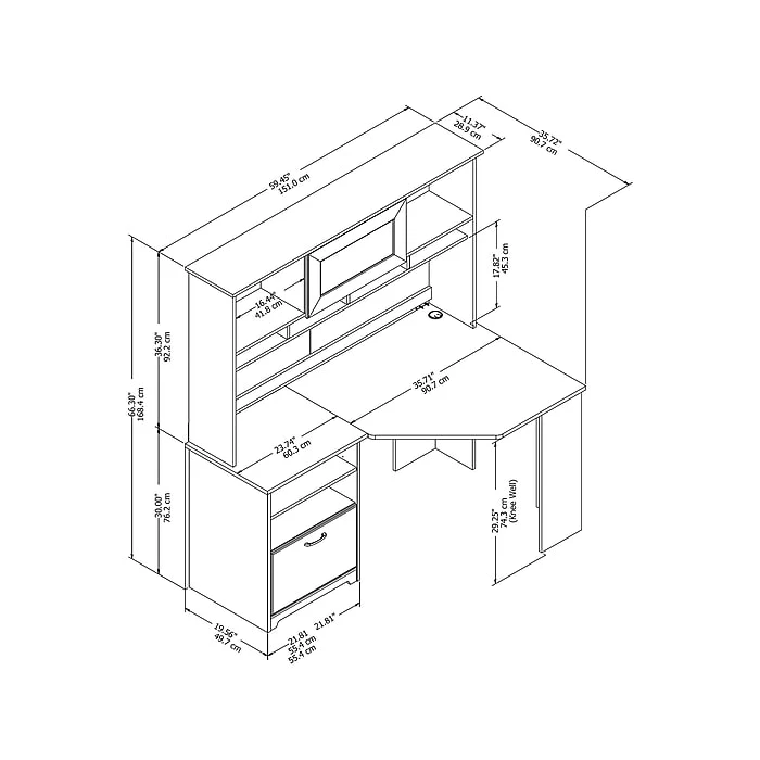 - Bundle includes: 60″W corner desk with storage, 60″W hutch