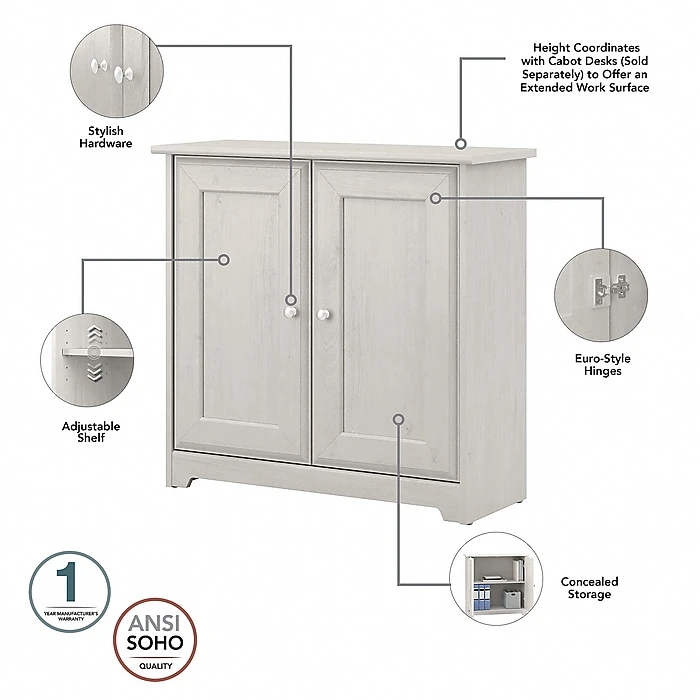 The stylish and functional Bush Furniture Cabot L-shaped desk with hutch and small storage cabinet offers a spacious work area for your home or office. Enjoy a beautiful traditional look with smart features. The L-shaped desk design provides a large, durable work surface and storage details, including an enclosed cabinet with a stylish fluted glass door, a box drawer for supplies, and a full-extension file drawer gliding on smooth ball bearing slides. Technology features such as a built-in four-port USB hub add convenience. The hutch boasts a matching fluted glass door, large open compartments, and four work-in-process areas. The small storage cabinet with doors offers a stylish approach to organizing books, personal items, or supplies. Keep everything in order and out of sight with an adjustable shelf to accommodate items of varying sizes. Meets ANSI/SOHO standards.