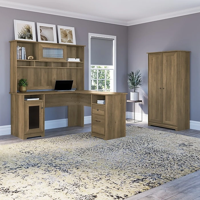 Timeless style and smart features make the Bush Furniture Cabot bundle a great fit for any home office. The stylish and functional Bush Furniture Cabot L-shaped desk with hutch and tall storage cabinet with doors offers a spacious workplace for your home office. The L-shaped desk design provides a large work surface and storage details that include an enclosed cabinet with a stylish fluted glass door, a box drawer for supplies, and a full-extension file drawer. Keep devices connected while you work with a built-in four-port USB hub. The hutch boasts a matching fluted glass door, large open compartments, and four work-in-process areas to keep your desk surface clutter-free. The tall storage cabinet with doors offers a stylish approach to concealed storage for books, personal items, or supplies with two adjustable shelves and two fixed shelves that accommodate a variety of storage needs. This home office set meets ANSI/SOHO standards for safety and performance.