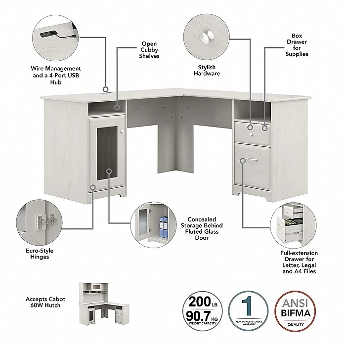 Work in style with the Bush Furniture Cabot L-shaped computer desk with hutch and lateral file cabinet. Enjoy a beautiful traditional look with smart features for your convenience. The L-shaped desk provides a large durable work surface and storage that includes a cabinet with a stylish fluted glass door, one box drawer, and one file drawer. Keep devices connected with a built-in four-port USB hub. The hutch has a matching fluted glass door, open compartments, and four work-in-progress areas along with a cable management system to control cords. The lateral file cabinet has two spacious drawers that open on smooth ball bearing slides for an easy reach to letter- and legal-size paperwork.
