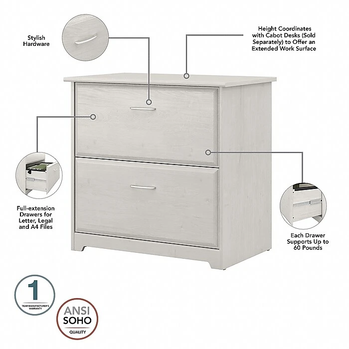 - Features a box drawer and a full-extension file drawer for convenient storage