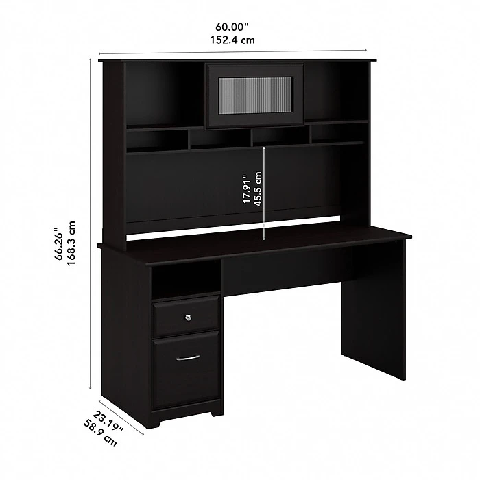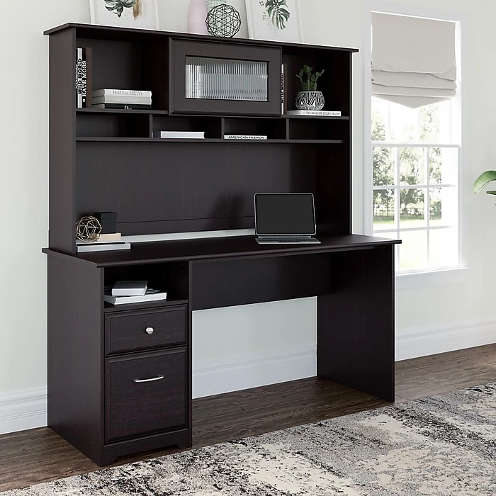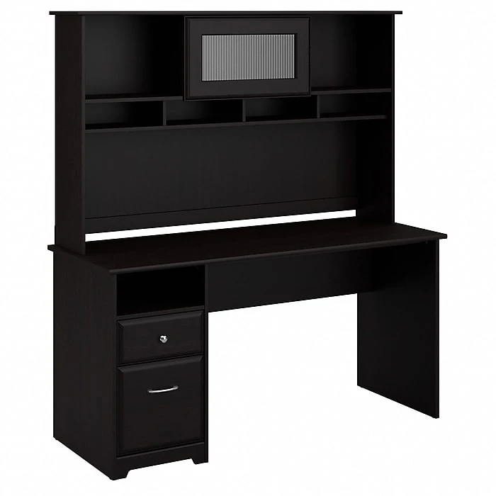 Create a stylish, functional and organized home office with the Bush Furniture Cabot 60W Computer Desk with Hutch and Drawers. The spacious work surface allows you to spread out with your laptop, papers, printer and more with room to spare. Store files and supplies in the included drawers and open cubby shelf, designed for quick and easy access. A smooth full-extension drawer opens effortlessly on reliable ball bearing slides so you’ll have no trouble reaching your letter or legal-size files. The Hutch offers an eye-catching flip-up door and includes open storage for books or decorations. Backed by a Bush Furniture 1 Year Manufacturer’s Warranty, the Computer Desk with Hutch and Drawers meets ANSI/SOHO quality test standards for safety and performance.