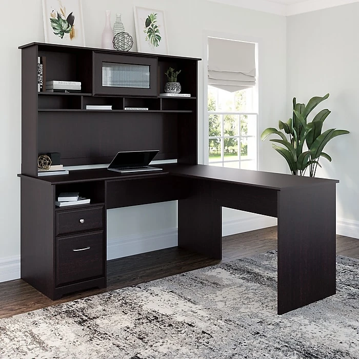 Create a stylish, functional and organized home office with the Bush Furniture Cabot 60W L Shaped Computer Desk with Hutch and Drawers. The spacious work surface allows you to spread out with your laptop, papers, printer and more with room to spare. Store files and supplies in the included drawers and open cubby shelf, designed for quick and easy access. A smooth full-extension drawer opens effortlessly on reliable ball bearing slides so you’ll have no trouble reaching your letter or legal-size files. The space-saving desk design is ideal for placement in a corner, while the Hutch offers an eye-catching flip-up door and includes open storage for books or decorations. Backed by a Bush Furniture 1 Year Manufacturer’s Warranty, the L Shaped Computer Desk with Hutch and Drawers meets ANSI/SOHO quality test standards for safety and performance.
