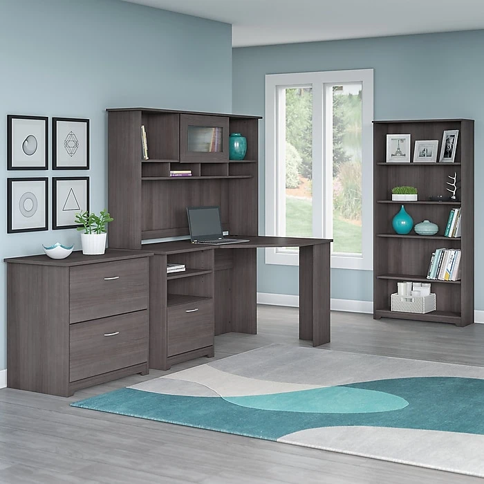 The Bush Furniture Cabot Corner Desk offers ample storage, technology integration and plenty of workspace for a stylish addition to your home office. The customizable Corner Desk adjusts to fit your needs as the pedestal attaches to the left or right side for added comfort and convenience. Perfect for placement in a corner, the unique design saves space but still gives you a roomy work surface to spread out and be productive. A full-extension file drawer glides on smooth ball bearing slides for an easy reach to the back, while an open cubby shelf works perfectly for storing books and more. Cable management grommets on the Corner Desk surface let you easily hide unsightly cords, while Chrome-finished hardware provides a simple and timeless appearance you’ll love in your home or small office. See the full collection for coordinating items. Backed by a 1 Year Warranty.